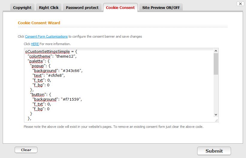 3. Click the link for Consent Form Customizations to generate a simple or advanced Cookie Consent banner that matches the look and feel of your site.