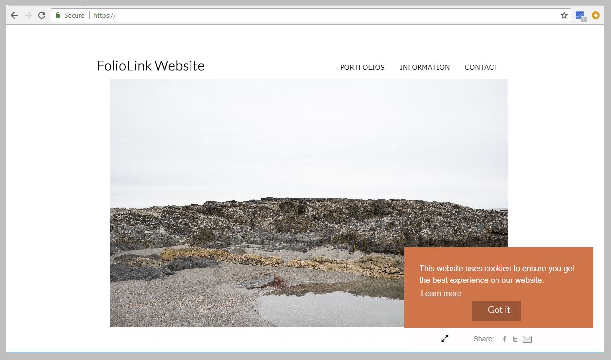 Here is how the cookie notice may appear in a FolioLink Artist Website: